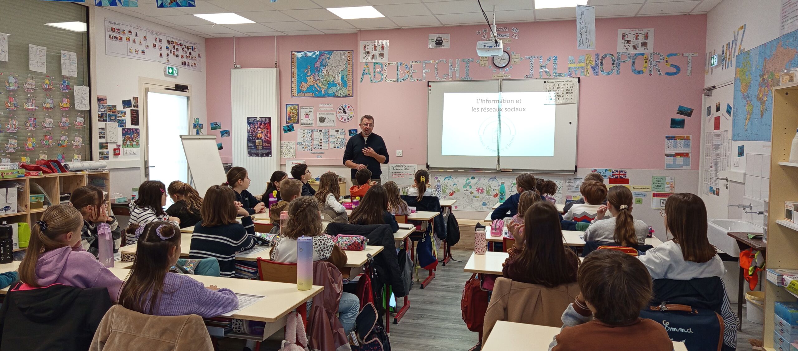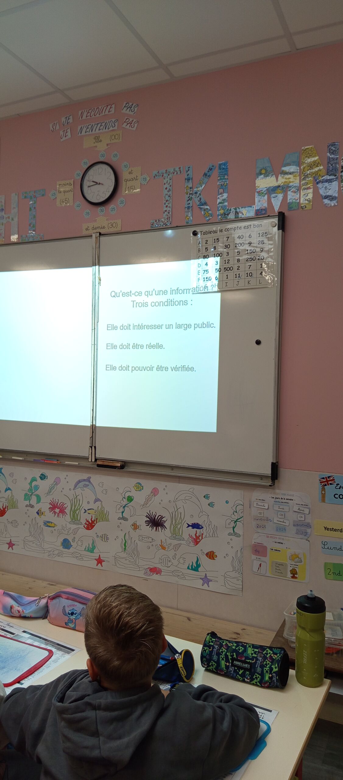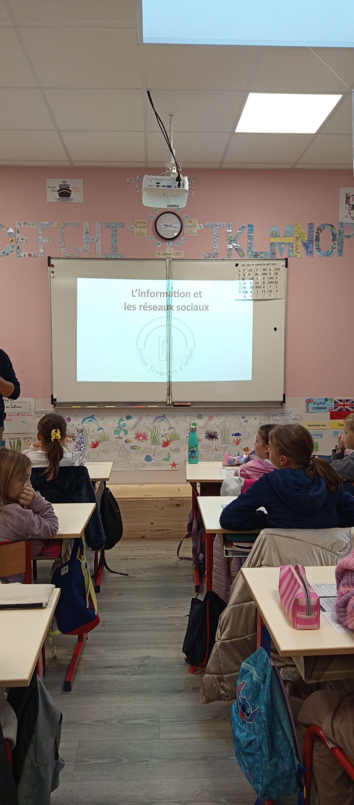 Le jour de la rentrée, une personne de l’association « Traqueurs d’infaux » est venue dans notre classe et dans celle de Nathalie. Ce monsieur leur a parlé des dangers d’Internet et de la quantité de fausses informations que l’on peut y trouver. Il leur a montré comment voir si une onfo est réelle ou fausse!