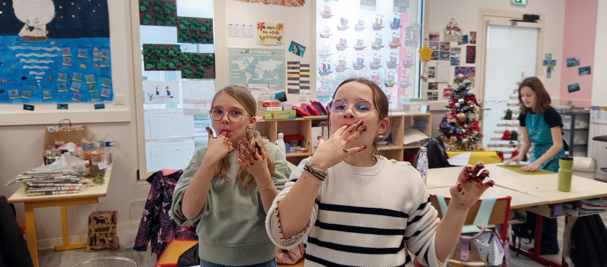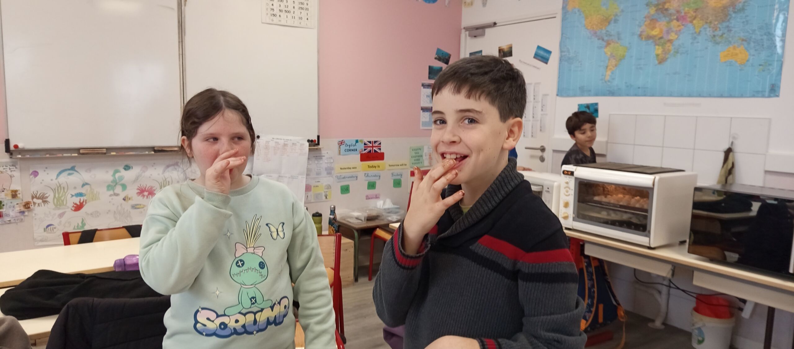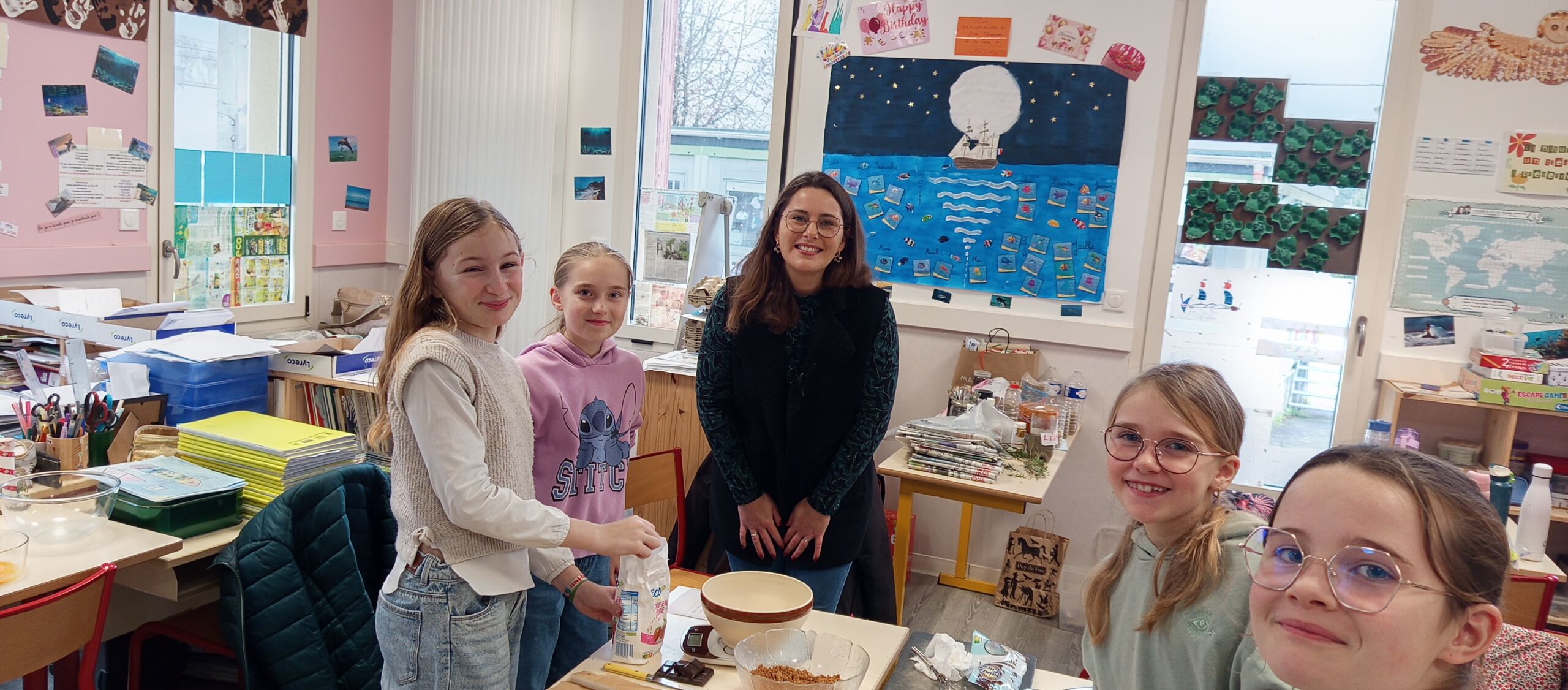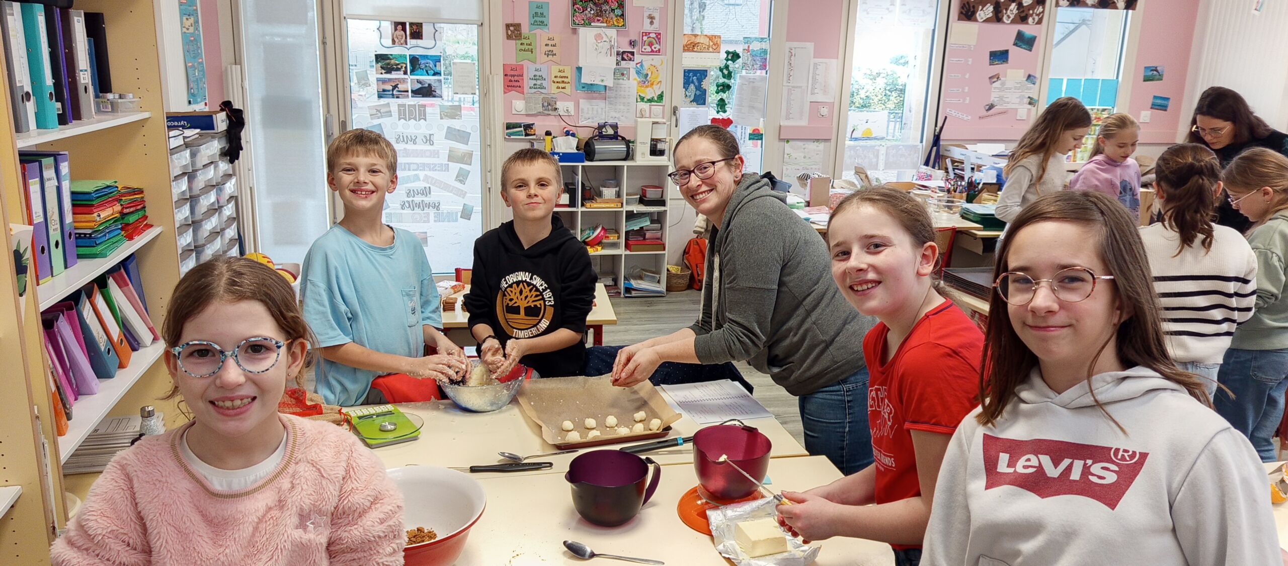 Chaque classe a appris des chants pour enchanter les parents le soir du marché. Et enfin dans chaque classe égalempent des petites préparations culinaires ont été cuisinées. Dans notre classe, nous avons préparé des Crunchies et des rochers Coco, très appréciés des élèves….surtout le chocolat! Les élèves se sont régalés en lèchant les plats et leurs doigts remplis de chocolat!