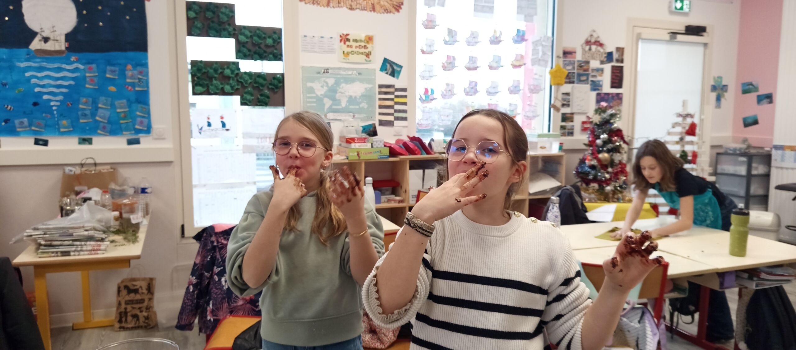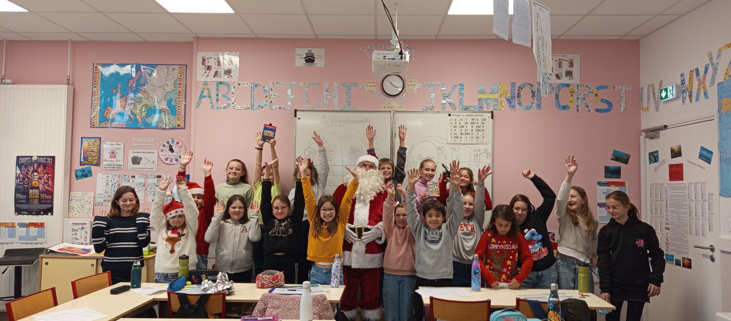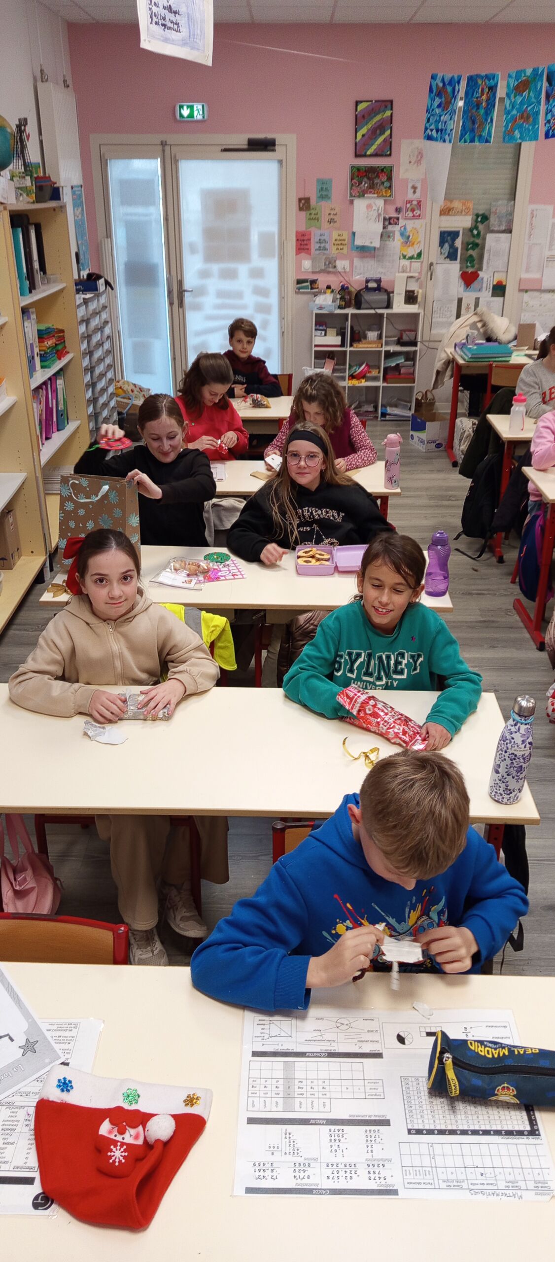 Enfin, dans notre classe, le vendredi 19 décembre a été bien chargé: le matin, nous avons fait des bricolages de Noël, puis les enfants ont pu jouer aux jeux de société. En début d’après-midi, nous avons viusalisé le film « Sauvez Willie » en rapport avec le thème de la mer! Puis après la récréation, nous avons fait notre « Secret Santa ». Les élèves avaient pioché le nom d’un copain de classe afin de lui fabriquer (rien à acheter) ou cuisiner un petit cadeau! Ce fut un beau moment d’échanges. Et pour finir cette belle journée, la maitresse avait apporté un goûter de Noël: pains au lait et barres de chocolat ainsi que des Schokobons à déguster en classe!
