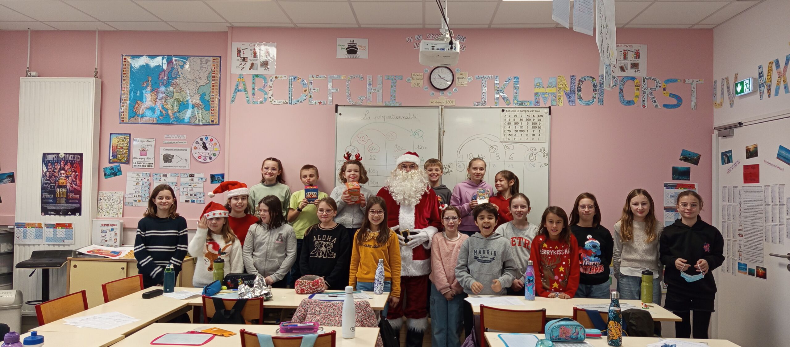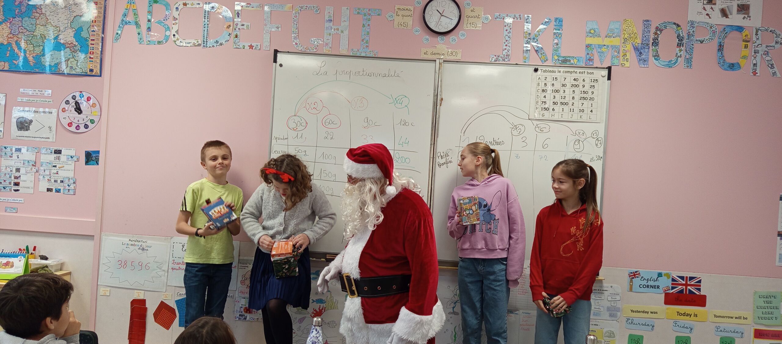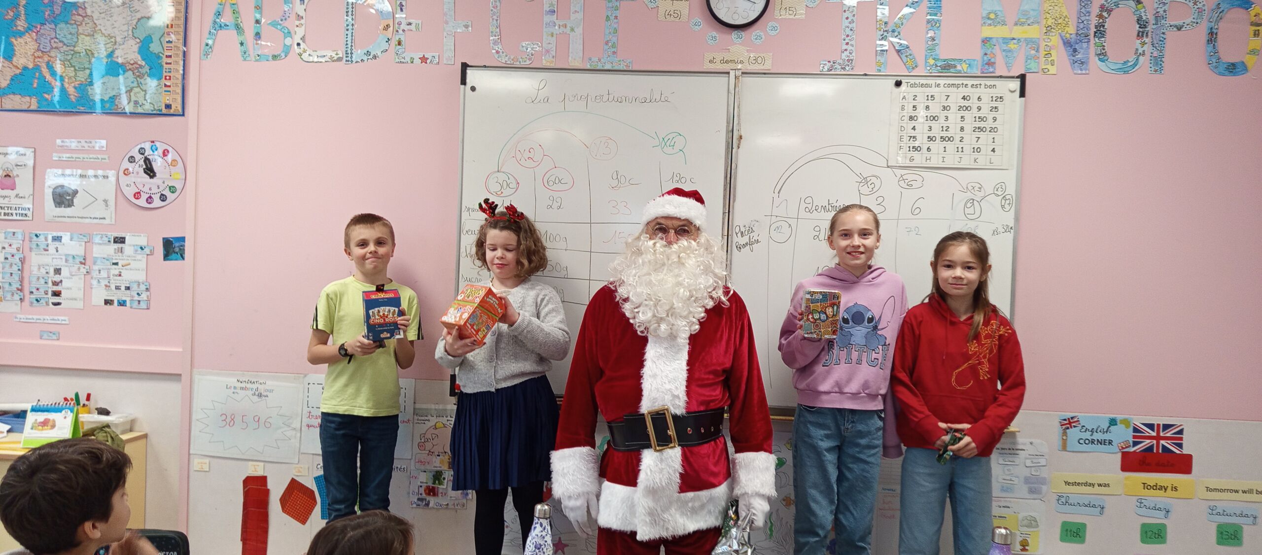 Le Père-Noël est passé dans chacune des classes afin d’offrir aux élèves un sachet de friandises avec une clémentine et des jeux de société, du moins pour nore classe: « Time’s Up »; « Twin it » et « Les cinq rois ».