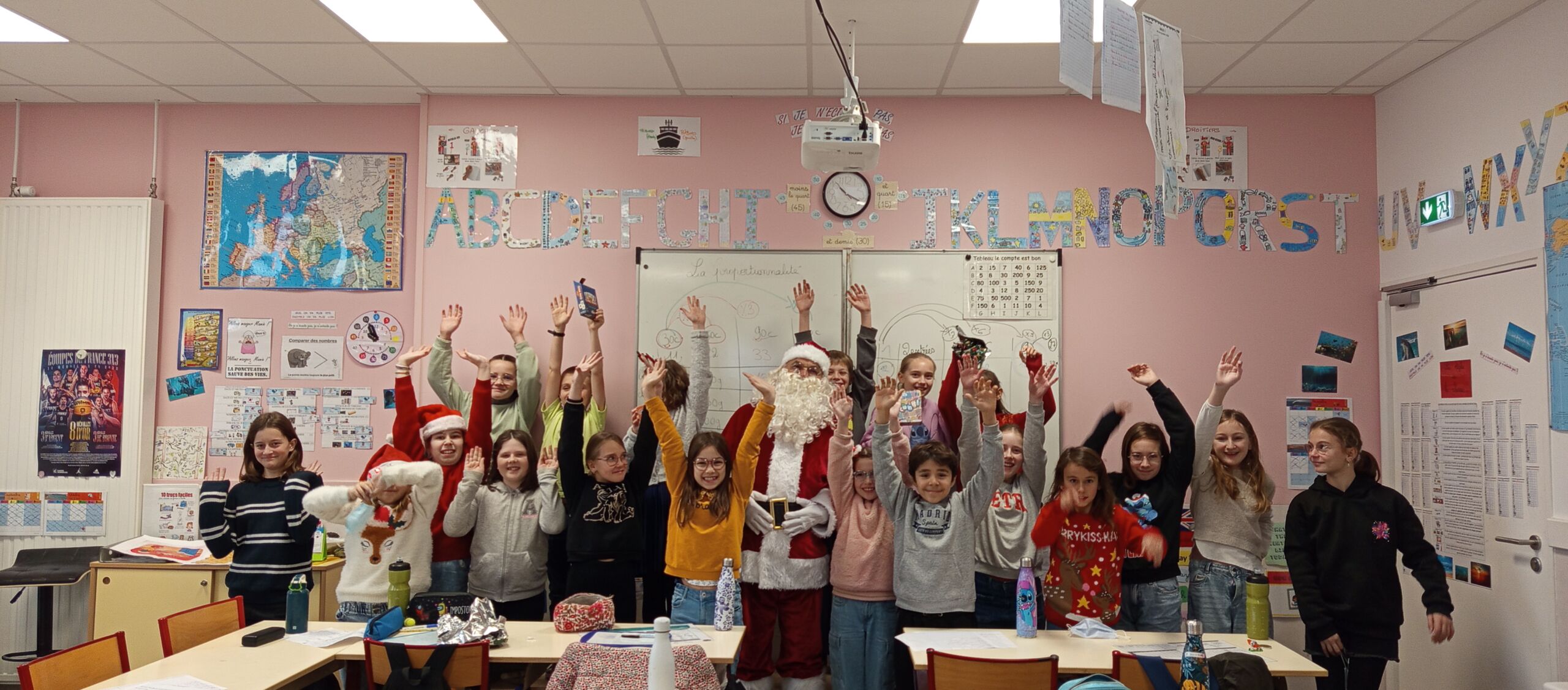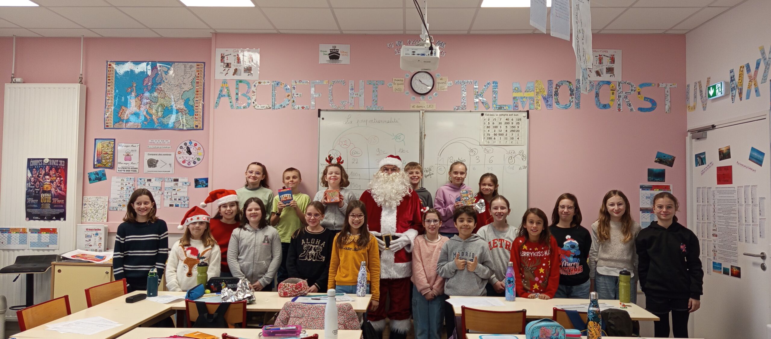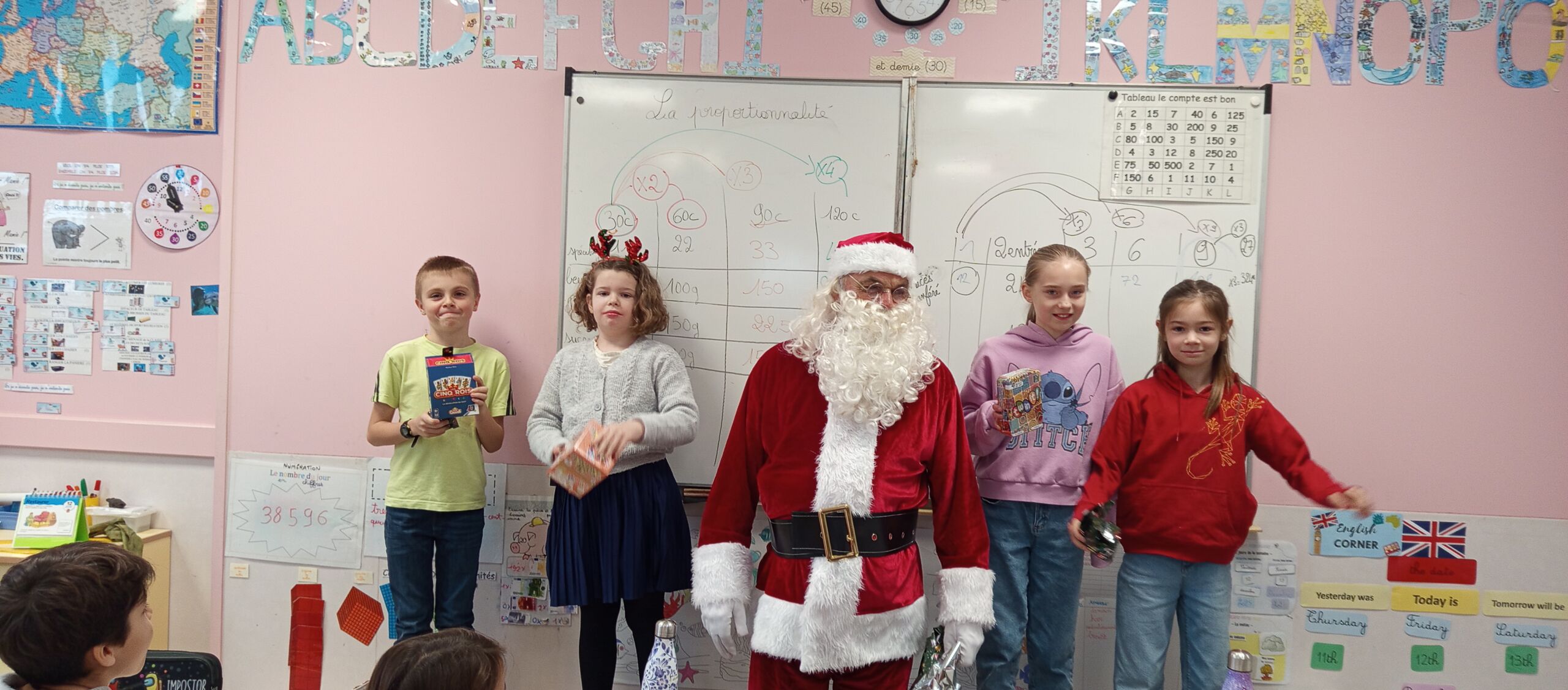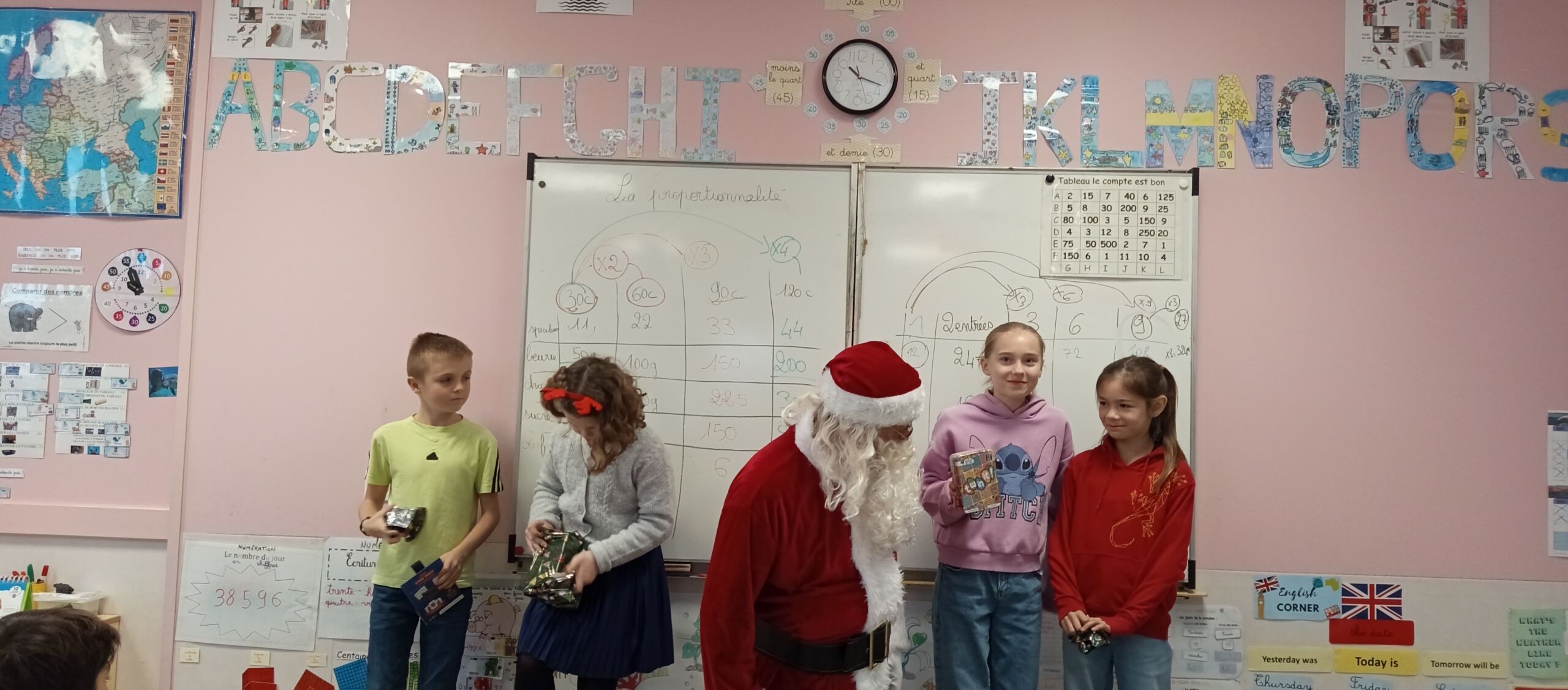 Le Père-Noël est passé dans chacune des classes afin d’offrir aux élèves un sachet de friandises avec une clémentine et des jeux de société, du moins pour nore classe: « Time’s Up »; « Twin it » et « Les cinq rois ».